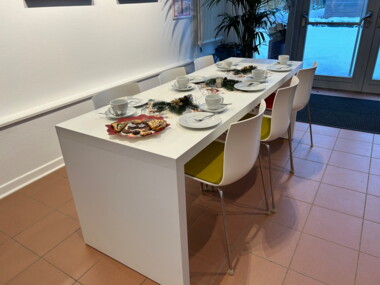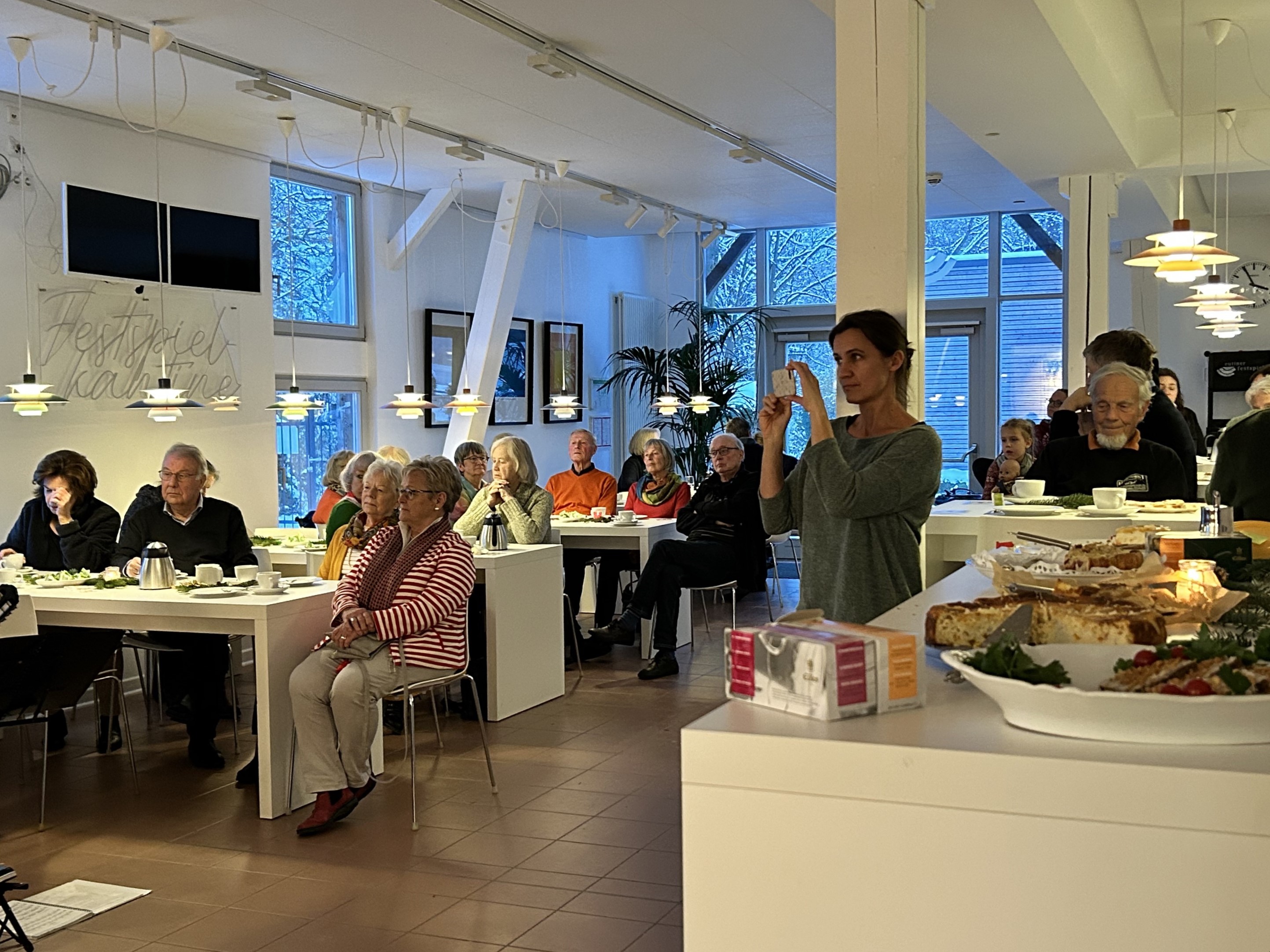 Einige Freiwillige hatten die Tische liebevoll und weihnachtlich eingedeckt. Ein Teil des "bewährten Bäckerteams" sorgte für Kuchen, Torten, Plätzchen und Schmalzbrot, Kaffee und Tee wurden von den Eutiner Festspielen gesponsert.